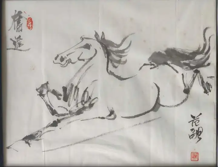• 以写意泼墨为主,用浓墨重彩勾勒马的鬃毛、尾部,以淡墨晕染躯体,浓淡干湿变化自然,既保留了国画的笔墨韵味,又精准还原了马的肌肉结构与奔腾的动态张力。